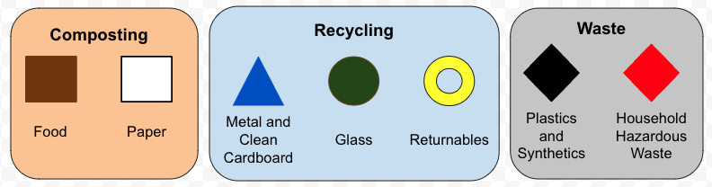 I picked these shapes and colors to make it easy for everyone to do the right thing. Consistency over time builds good habits. A brown square sticker on your compost pail with a note, “Food scraps and paper to compost,” a blue triangle on your recycling bin with a note, “Metal and glass to recycle,” and a black diamond sticker on your landfill trash bin with a note, “Plastic trash to landfill,” makes it easy to know at a glance which is which and what to do.