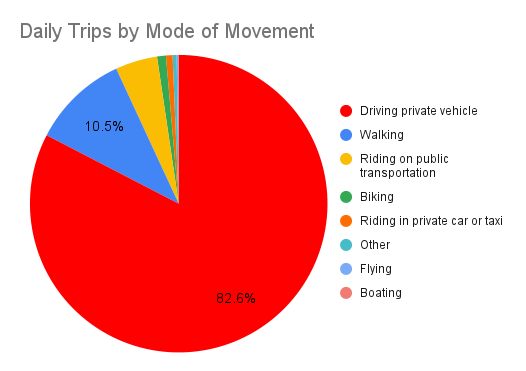 Data from the US Federal Highway Administration’s National Household Travel Survey shows how much we prefer to drive, compared to other modes of movement.