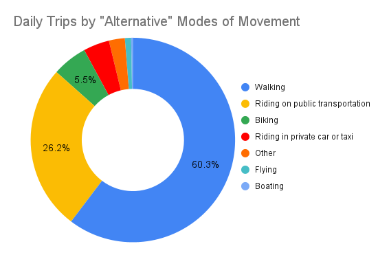 Of all the “alternative” forms of moving from place to place (besides driving a private vehicle), walking is the most popular.