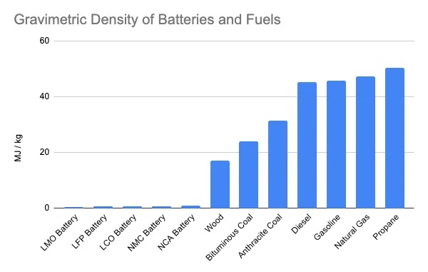 The higher the gravimetric density (joules per gram) of energy storage, the lighter the load—a critical factor for practical aviation. Here’s a chart that explains why we haven’t been flying with batteries (or wood or coal, for that matter):
