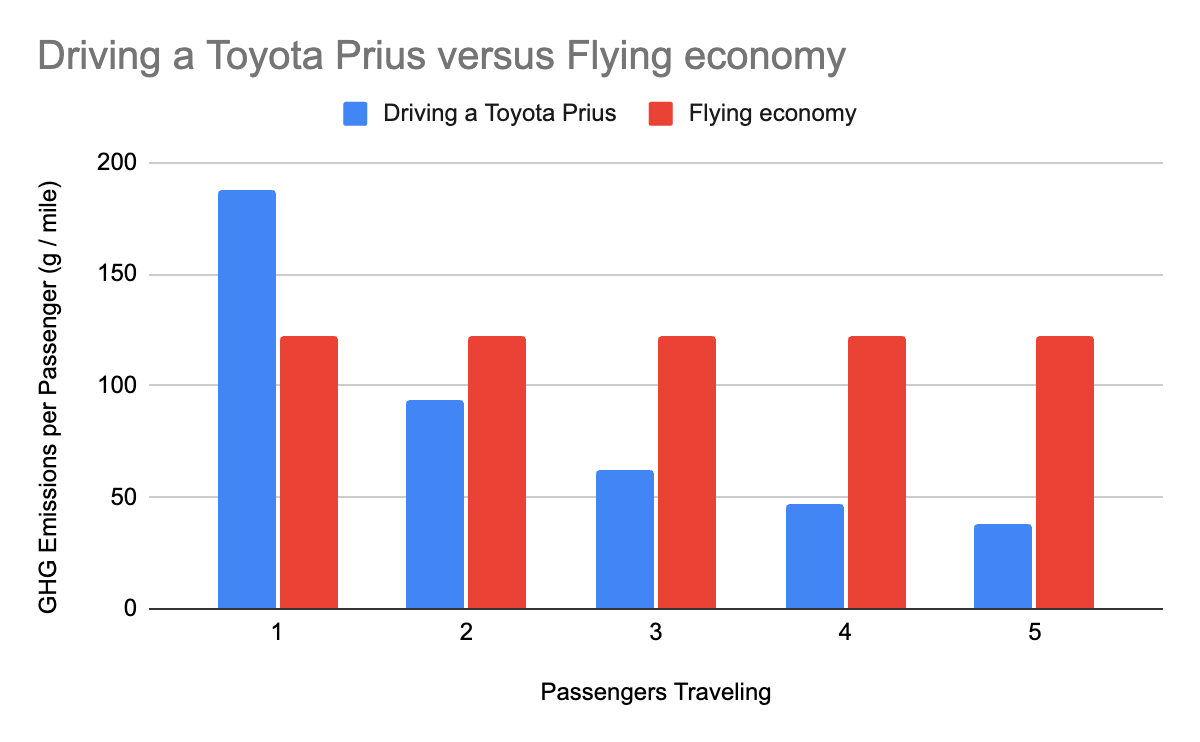 Flying instead of driving might save fuel and prevent pollution, depending mostly on passenger load factor—are there empty seats? One jet plane can carry 180 economy passengers, but one economy car can only seat up to five. Not surprisingly, to move 180 people two thousand miles (the distance between Boston and Salt Lake City, for example) it would be better to fly just one jet than drive 180 Toyota Priuses.