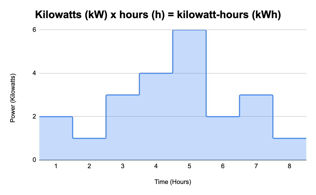 The metric unit of energy is a joule, but since it’s so easy to measure power in kW and time in hours, it’s customary to multiply those together and express energy as kWh. Using a kilowatt of power for an hour of time is a kilowatt-hour (kWh) of energy.