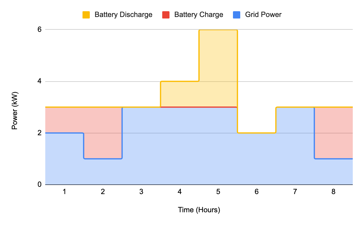 Batteries can help smooth out peak power spikes. If a public power grid supplies our electricity, we could lower our peak power demand on the grid by charging a battery when we have low power demand and discharging the battery (supplying part of our demand) when we have high power demand.