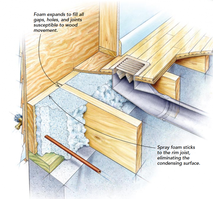 Spray foam at least three inches on your rim joists (also called “band joists”). In older construction, the rim joists are uninsulated—air can often leak around these boards to get into your basement, and heat only has to travel through a few inches of wood to leave. Spray foam prevents air flow, heat flow, and condensation.