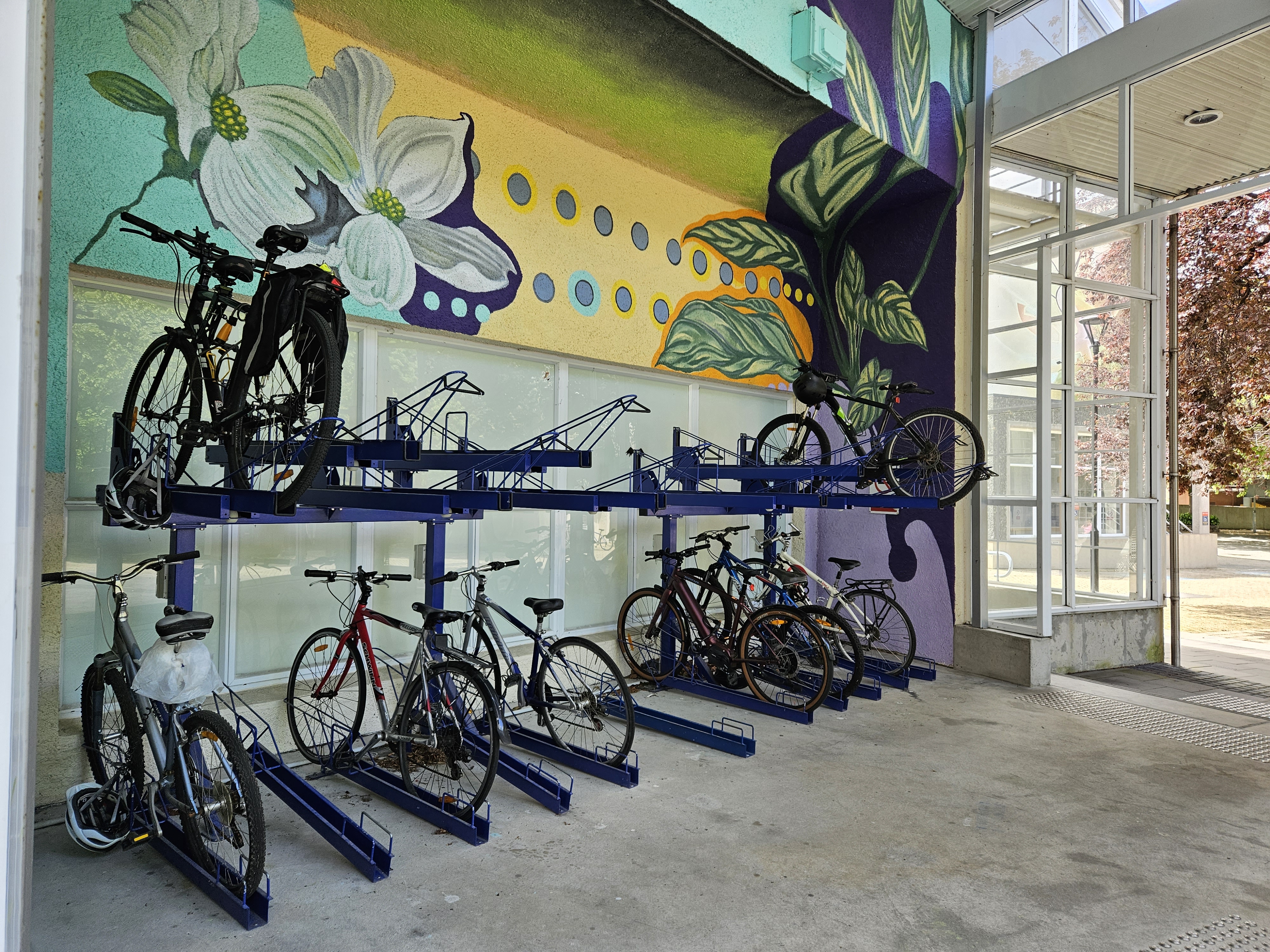 New Zealand may not quite be at the level of Japan when it comes to bicycle infrastructure, but it’s not far behind. We found an above-ground covered biking garage on the campus of the University of Otago that features an interesting two-level bike parking rack and tools for emergency bike repairs. Great ideas for any college or university campus!