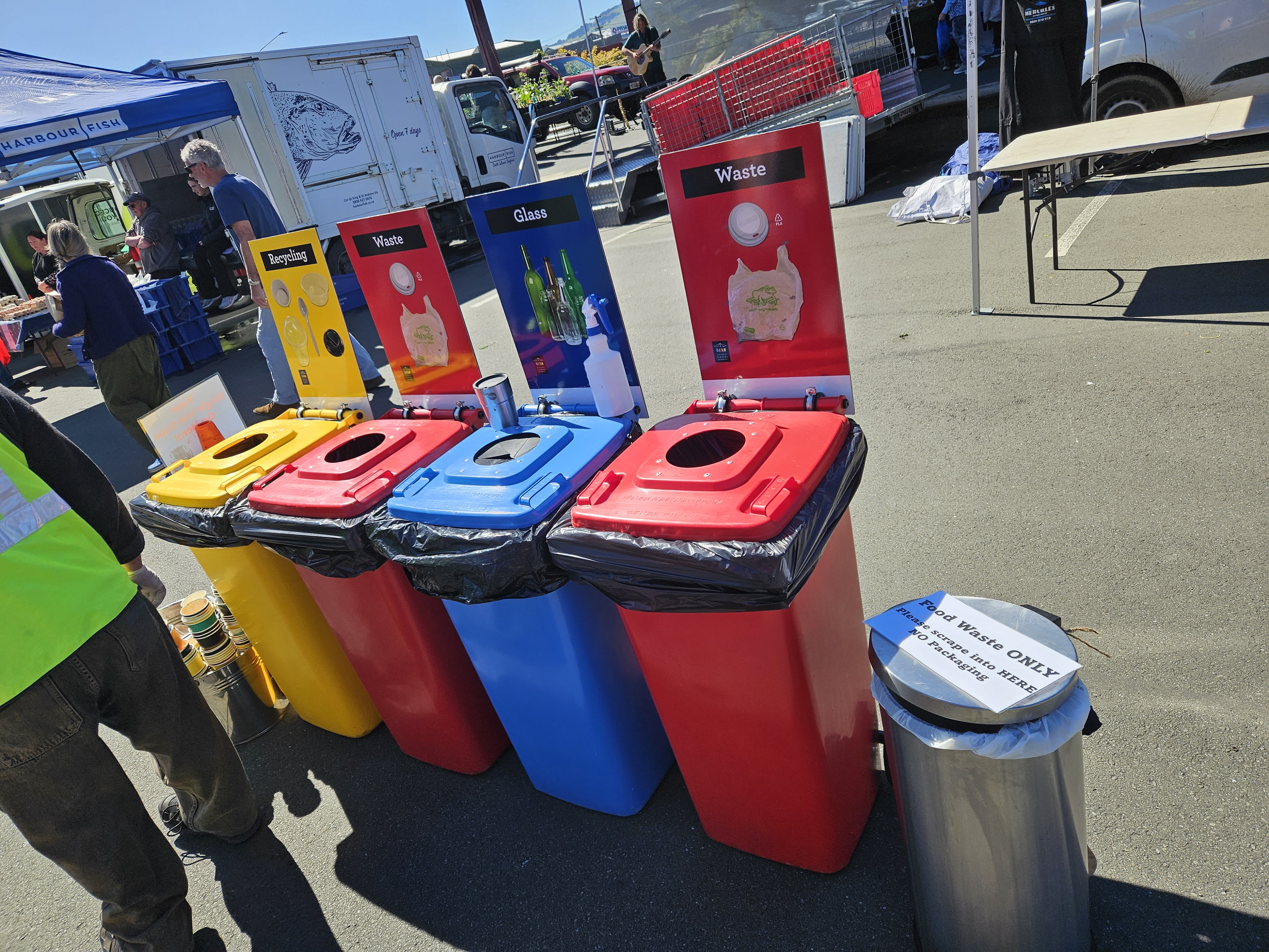 Having talked with hundreds of people about sorting their waste at public events, I really appreciated the clear signage and the standard colors of this system in New Zealand. Makes it so much easier for everyone to know what goes where when tossing their trash!