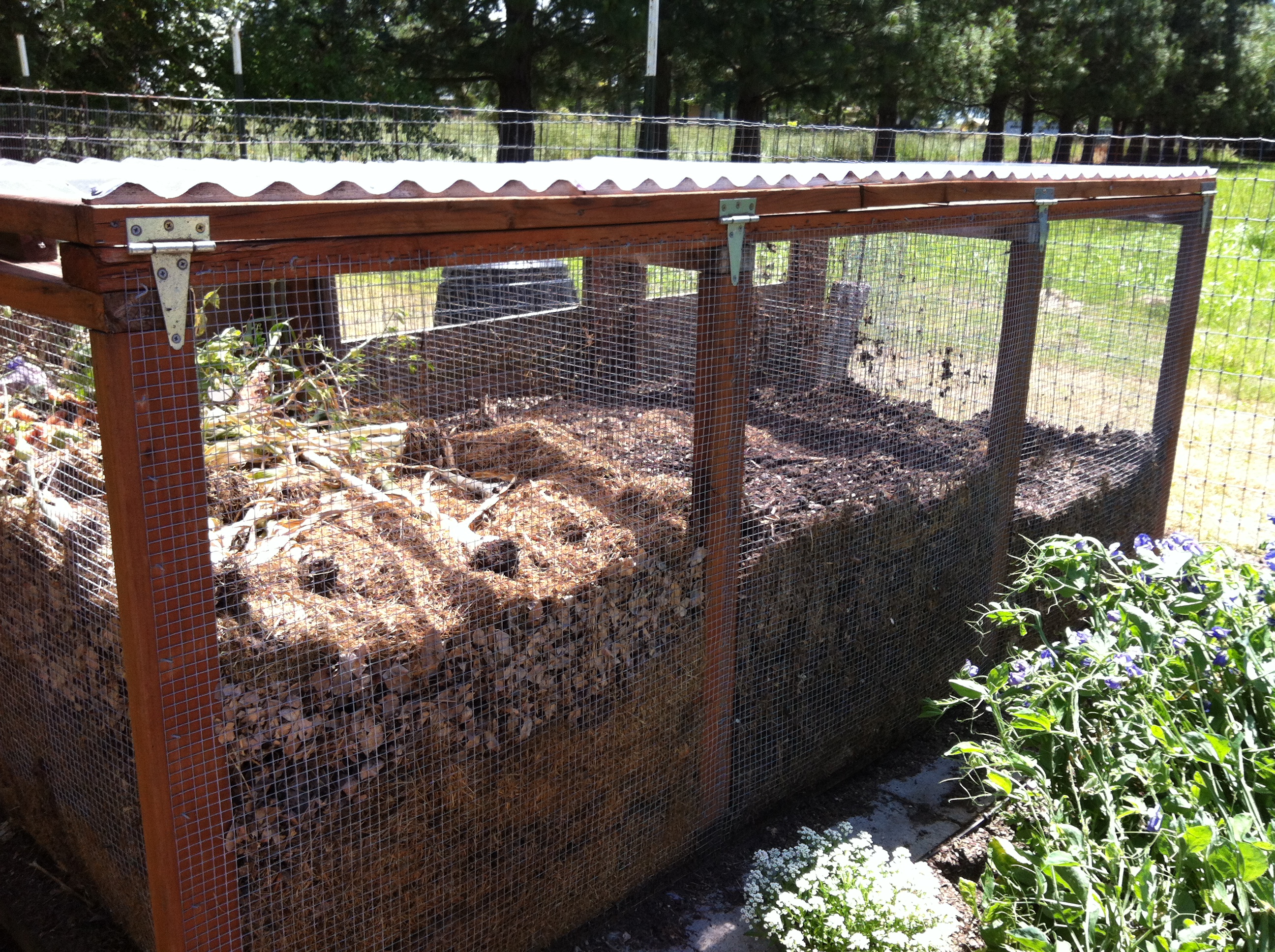 Start collecting and piling up material in the first chamber. Alternate greens and browns, putting browns on top and watering the material as you add it.